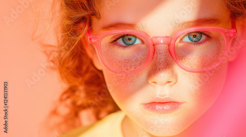 Close up of young Caucasian girl with freckles and pink glasses in bright sunlight illumination