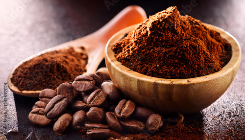 Roasted coffee beans and finely ground coffee powder on a textured surface