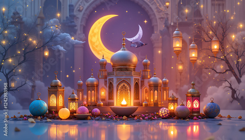 Ramadan Kareem with Colorful lanterns under a crescent moon