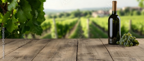 Rustic wooden table situated in a lush vineyard landscape, suitable for wine tasting or a countryside retreat