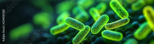 Plant chloroplasts glowing fluorescent green and yellow under UV, artistic macro design