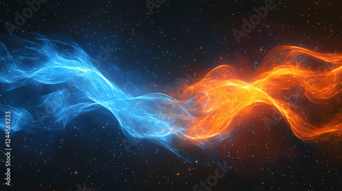 Abstract digital artwork depicting intertwining waves of orange and blue energy against a dark, starry background, suggesting cosmic forces or elemental powers. Elemental Forces. Illustration