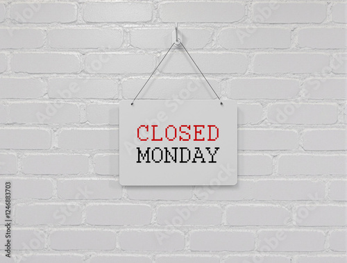 rustic closed monday notice sign, white background with red and black text, hanging from wire on white brick wall, soft even lighting
