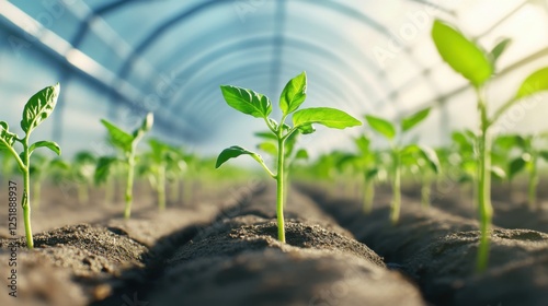 Small green tomato seedlings being planted in a modern greenhouse, warm diffused sunlight, symbolizing sustainable farming and fresh organic food