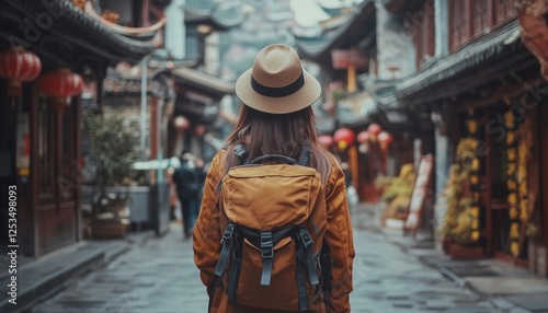 Adventurous Journey: A Young Woman Explorer Strolling Through The Historic Streets Of Shangri-La, Embracing The Thrills Of Travel Life