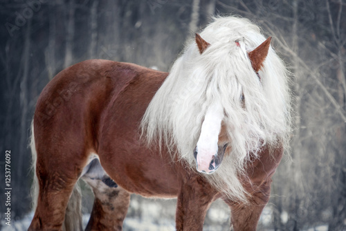 Kasztanowy koń zimą z bujną, białą grzywą – siła, majestat i piękno natury. Jego gęste, rozwiane włosy kontrastują z zimowym krajobrazem, podkreślając niezwykły charakter tego zwierzęcia.