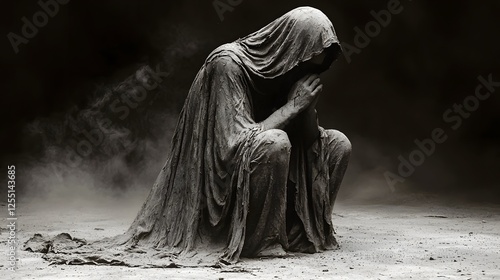 Cloaked figure in a desolate moody landscape engulfed in an ominous atmospheric shroud of