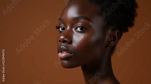 A striking portrait of a woman with a smooth, matte complexion.