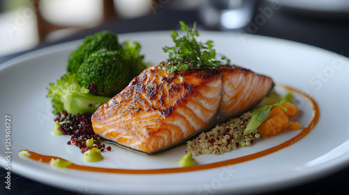 of grilled salmon with steamed broccoli and quinoa, served on a modern dining table