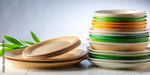 Eco-friendly biodegradable plates stack neatly. Sustainable and compostable dishware for a greener event. White background.