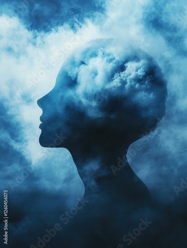 cloudy mind brain fog concept silhouette of head blue cloudy background loneliness anxiety pensive mental health awareness psychology psychiatry mindfulness abstract