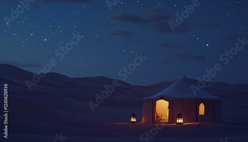 A desert landscape at night, featuring a round, light brown tent illuminated by warm, interior light and exterior lanterns under a vast, star studded sky. The tent is situated in a sand dune