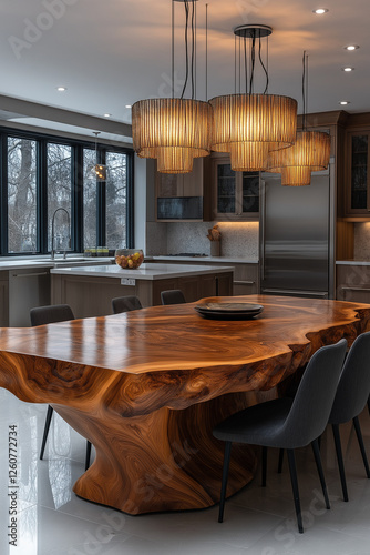 Photographie immobilière d'une salle à manger moderne avec table en bois, décoration minimaliste et lustre élégant. HDR, 3D, design, tendance, architecte
