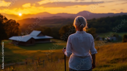 Elderly Woman Silhouette Viewing Sunset Over Rolling Hills in Washington State