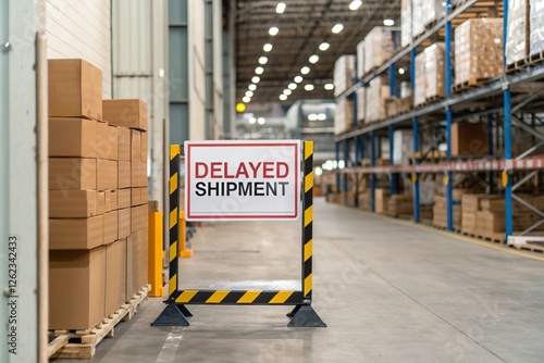Delayed shipment sign in warehouse. Logistics problem and supply chain disruption