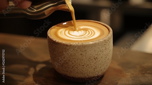 Artisan coffee being poured into a ceramic cup, latte art, cozy caf vibe,