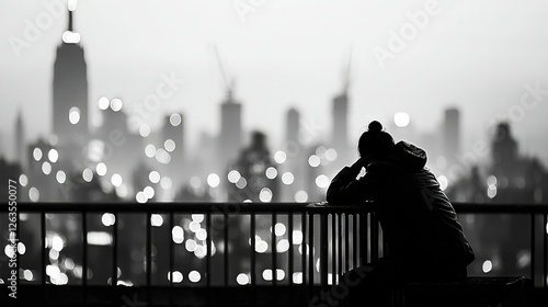 A monochrome image of a person resting on a bench amidst an urban landscape under twilight