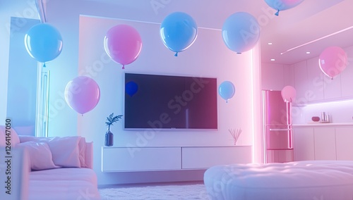 Neon party room with floating balloons