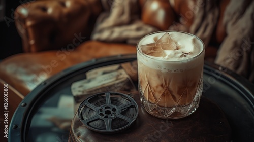 A classic White Russian cocktail served in a glass, placed on a leather surface, highlighting its creamy texture and rich, moody ambiance.