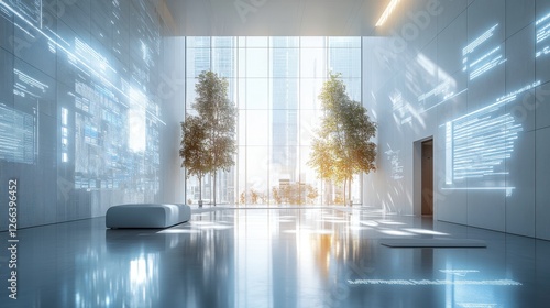 A modern, bright interior with large windows, featuring trees, reflective surfaces, and digital projections creating a serene ambiance.