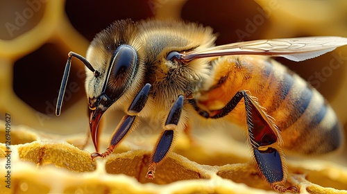 Close-up of a bee collecting nectar on a honeycomb in a vibrant, sunlit environment