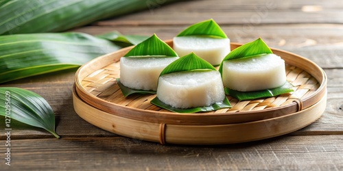 Steamed glutinous rice cake with sweet coconut milk and pandan leaves, traditional malay dessert, steamed rice cake