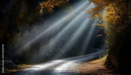 Magical autumn scene sunbeams illuminate a winding road through a dark, mysterious forest, with fallen leaves and rock walls.