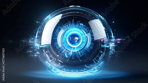 A digital futuristic eye with holographic projections and high tech interface elements showcasing the power of advanced analytics and visualization in a cutting edge technological landscape