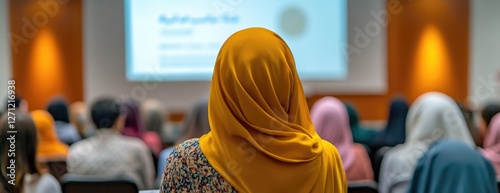 Woman in hijab attends presentation. Conference hall. Stock photo