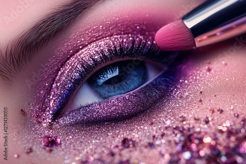 Oko z błyszczącym fioletowym cieniem do powiek i pędzlem do makijażu w ekstremalnie zbliżonej estetyce