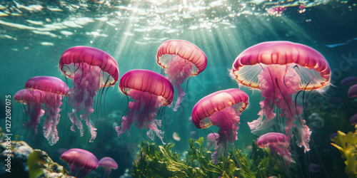 Colorful jellyfish in pink and red hues swim elegantly in crystal-clear waters, illuminated by shafts of sunlight from the ocean surface