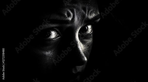 A close-up of intense eyes staring from deep shadows creating a dramatic and mysterious effect with high contrast and a sense of unease