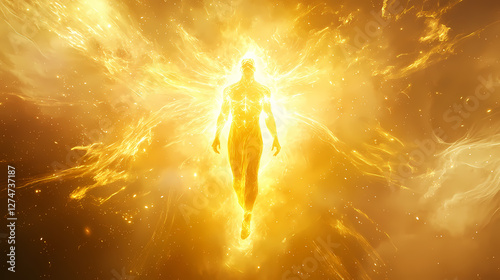 Luminous being ascends in a golden blaze, surrounded by celestial light and glowing with intense divine energy. Transcendent Light Beings. Illustration