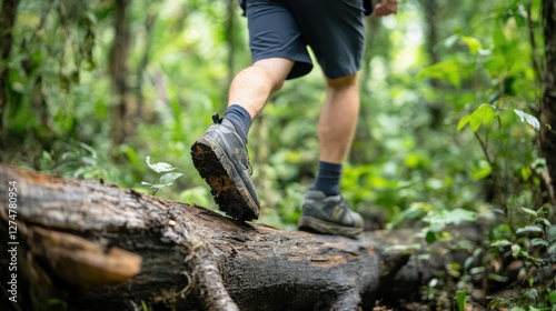 An explorer carefully steps over a fallen tree trunk in the dense jungle, surrounded by vibrant greenery and natural light