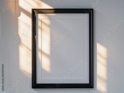 Black Framed Picture Frame Mockup on White Wall with Natural Light and Shadows