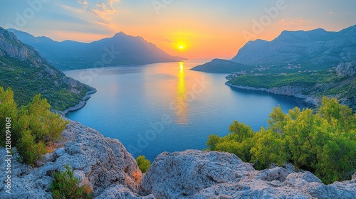 Sunset over Adriatic Sea bay, mountain view, calm water, travel postcard