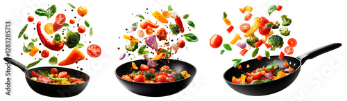 A set of black frying pan with fresh vegetables flying in the air, isolated on a transparent background. Colorful mix of tomatoes, bell peppers, broccoli, red onions, and basil