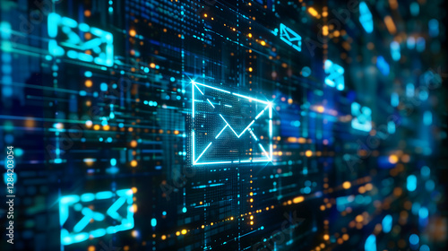 Futuristic digital email communication network with glowing neon icons representing cybersecurity encrypted messaging online data protection virtual inbox and secure internet connectivity