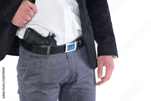 Attractive male holding gun in his hand. Assassin. Police officer. isolated on white