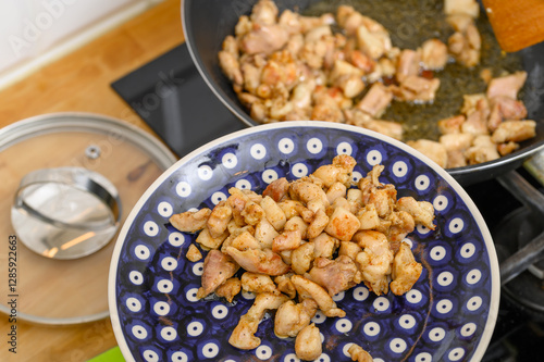 Kurczak pokrojony w kostkę usmażony na patelni,