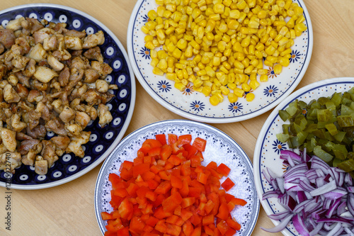 Kolorowe warzywa i mięso z kurczaka na talerzach, zdrowa żywność