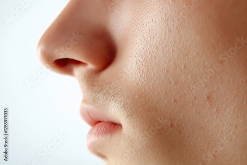 A person's nose in close-up on a white background, ideal for beauty or medical uses