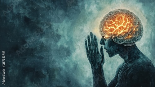 A contemplative figure with a glowing brain, symbolizing deep thought, creativity, and the power of the mind against a dark, atmospheric background.