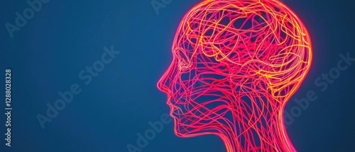 A vibrant, abstract representation of a human head, showcasing intricate lines resembling neural pathways against a blue background.