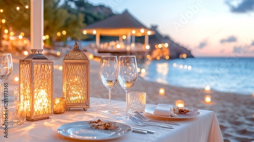 Cena romántica de una pareja junto al mar al atardecer en una hermosa playa iluminada por luces suaves