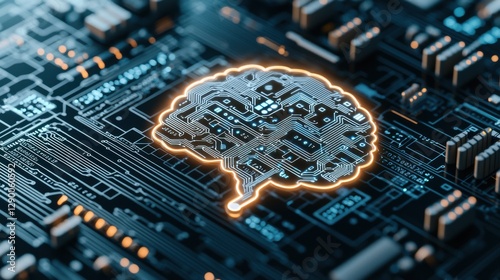 AI supervised machine learning. Digital brain design on a circuit board background.