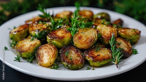 Roasted Brussels sprouts on a plate with herbs, dark background
