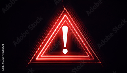 Glowing neon red triangle sign, exclamation point on dark. Warning indicator. Alert signal.