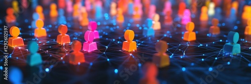 Colorful 3D avatars connected through glowing network lines represent digital social interaction in a virtual environment. Generative AI