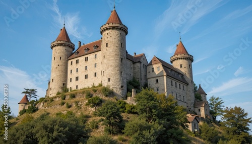An old European castle with stone towers situated atop a hill-